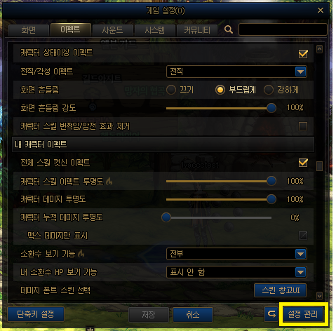- · 게임 설정 팝업 우하단에 추가된 [설정관리] 버튼을 통해 해당 팝업으로 진입 할 수 있습니다.