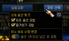 · 모두 선택 시 현재 교환 가능한 옵션을 모두 일괄 선택 합니다.- · 모두 선택 버튼에 마우스 오버 시, 세부 설정 메뉴를 선택할 수 있습니다.