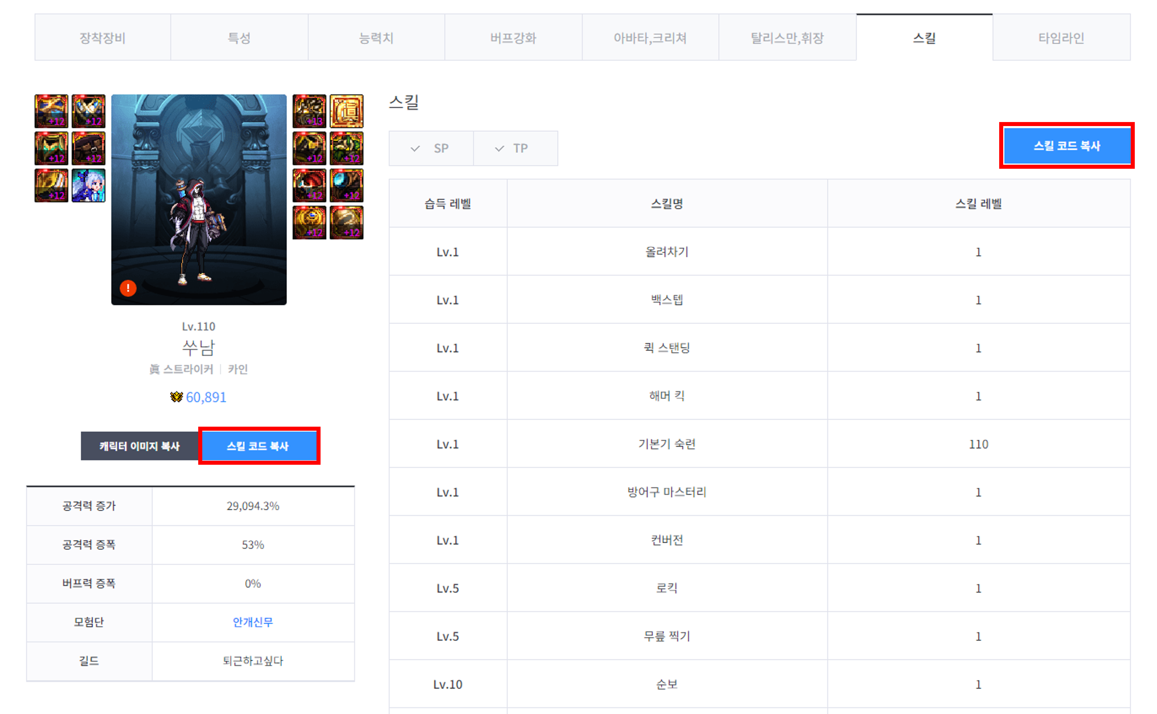 - · [복사하기] 버튼을 누르면 해당 스킬코드가 클립보드에 복사됩니다.