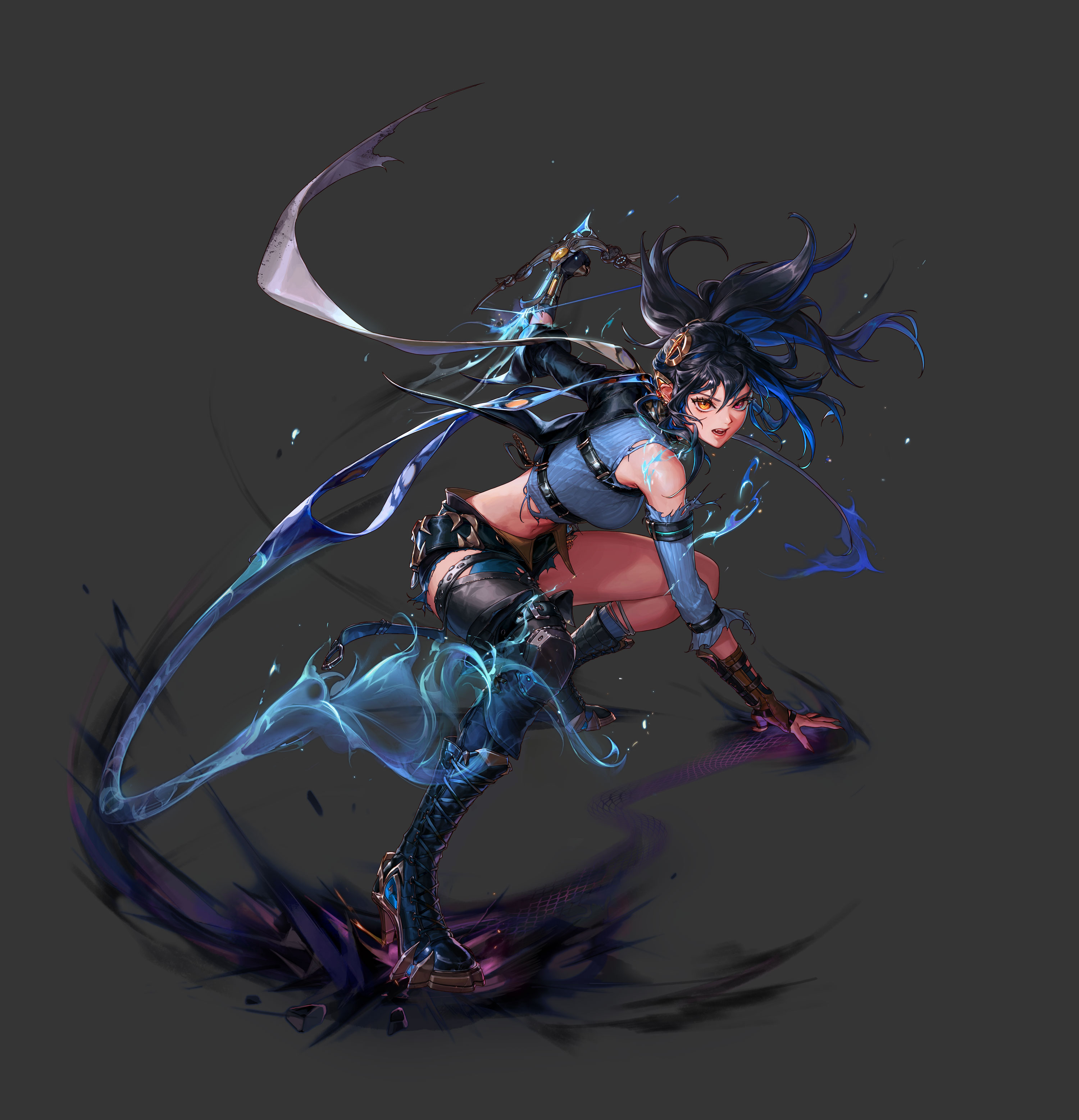 근처에서 가장 강한 적을 탐색하여 물어 낚아챈 후, 공중에서 적을 문 채로 회전하는 요수 칼날 데미지를 주며 낙하합니다.