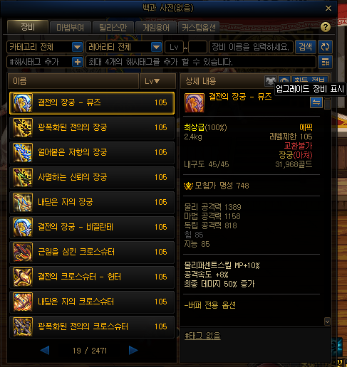 업그레이드 가능한 장비를 선택한 경우 상세 내용에 '업그레이드 장비 표시' 버튼이 추가됩니다.