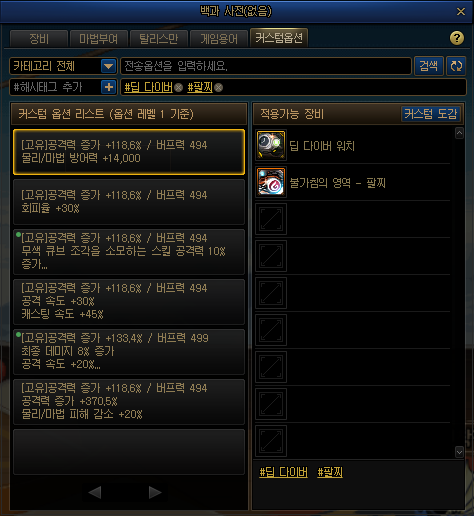 | 장비 탭 해시태그 이용 시 | 커스텀옵션 탭 해시태그 이용 시 |