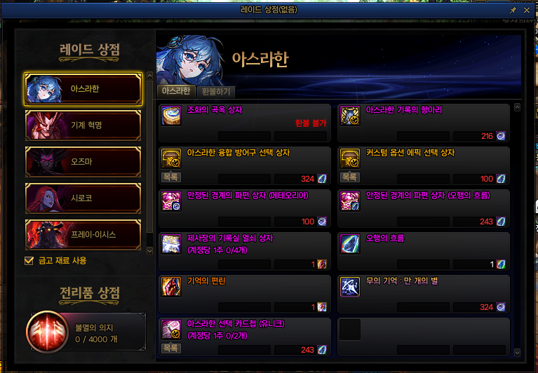 조화로운 안개의 큐브 1개 상자 | 조화로운 차원의 기운 800개 캐릭터당 월 2회 구매 가능 |