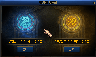 안개의 빛무리 | 계정 귀속 | 에픽 | 아래 2가지 카테고리 중 1종을 선택하여 해당 카테고리에 속하는 아이템을 균등한 확률로 획득할 수 있습니다. * 봉인된 미스트 기어 장비 55종 중 1종 * 기록/흔적 세트 에픽 장비 33종 중 1종 - 획득한 장비는 균등한 확률로 장비 등급이 적용됩니다.