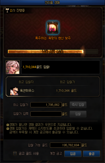 ㄴ 입찰에 사용할 수 있는 최대 골드는 캐릭터 소지 금액 한계와 동일합니다.