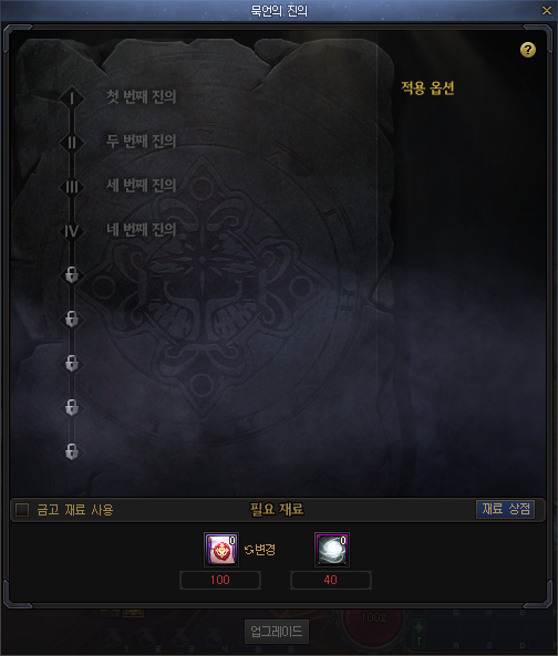 다음 NPC의 '서약 업그레이드' 또는 장착된 서약의 메뉴를 통해 묵언의 진의 업그레이드를 진행할 수 있습니다.